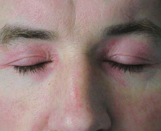The rash of dermatomyositis can be variable but may affect the area around the eyes (heliotrope rash), over the knuckles (Gottron papules), on the face and the “V” of the neck. It is usually red or purple in colour and can be very itchy, particularly when the scalp is affected. The fingernails may be ragged and the skin around the fingernails may be inflamed. The rash is often made worse by sunlight and is therefore more obvious on areas of the skin which are exposed to the sun.
