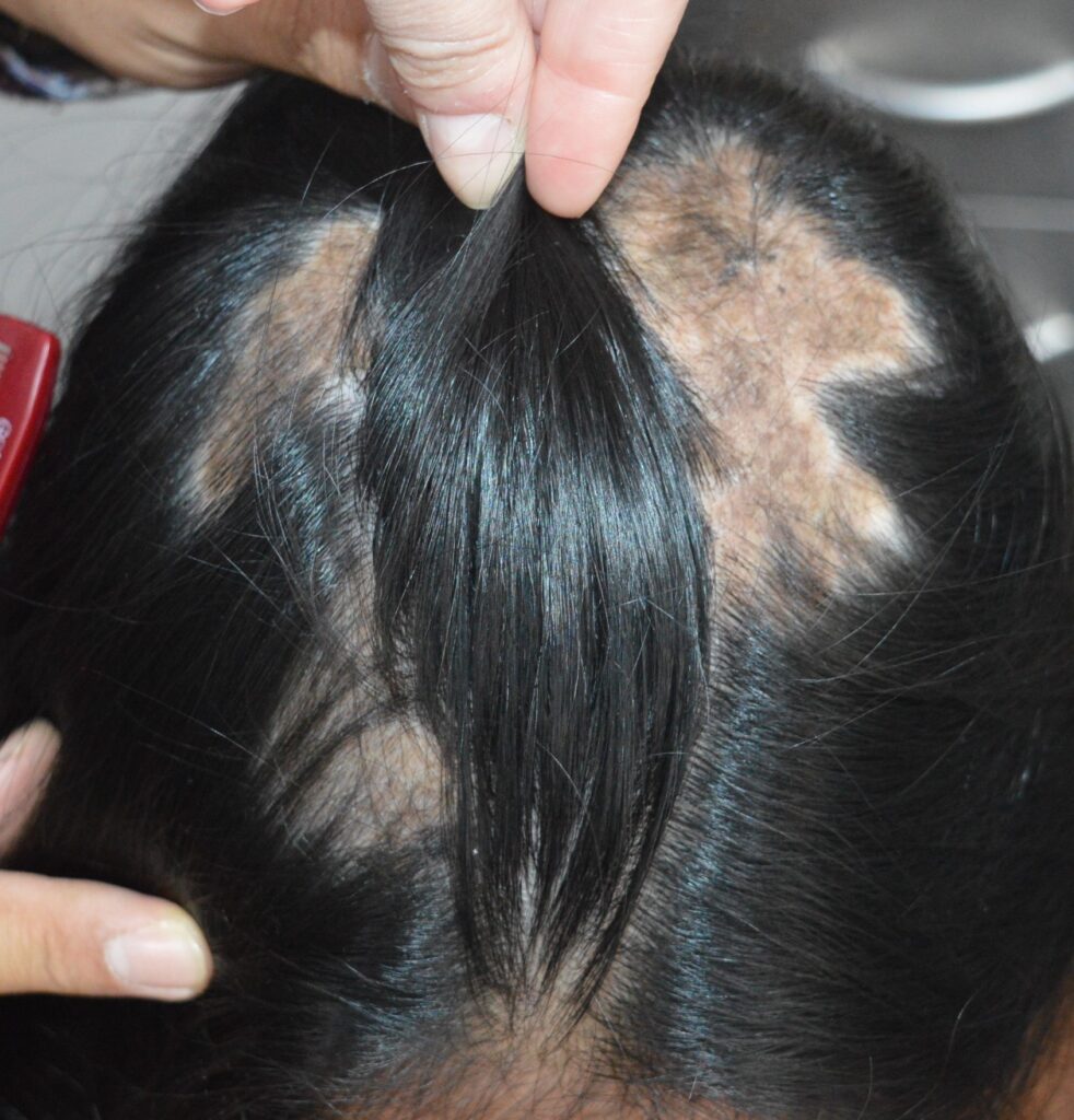 The term ‘lupus erythematosus’ refers to a group of related disorders. ‘Discoid’ lupus erythematosus (DLE) is a form of lupus erythematosus which is confined to the skin. It is characterised by localised red or pink scaly patches most often on the head and neck, including the scalp. Uncontrolled inflammation may lead to permanent damage to the skin and hair follicles resulting in irreversible hair loss.