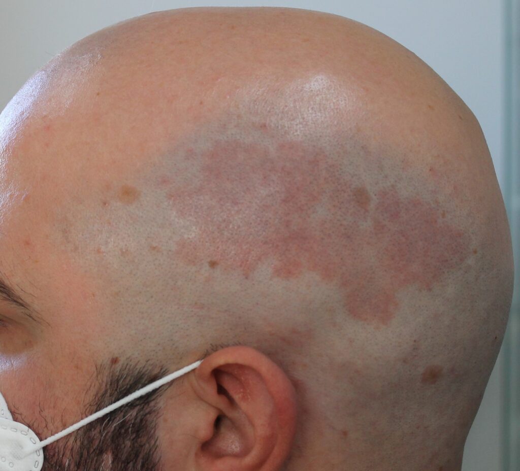scalp and hairline. It can affect babies (cradle cap), children and adults. The skin appears red